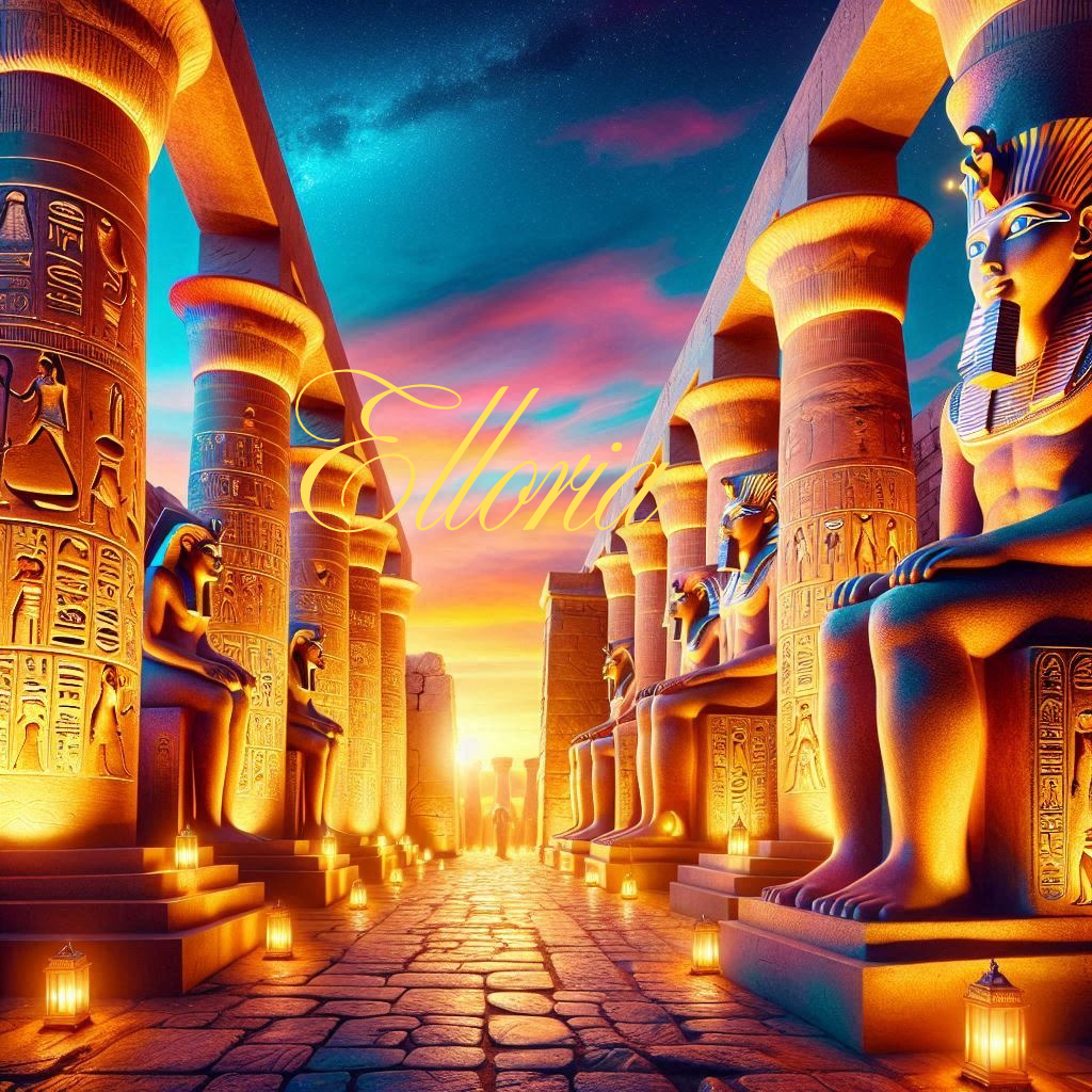 Plongez au cœur de l’Égypte éternelle avec cette majestueuse allée de statues et de colonnes hiéroglyphiques illuminées par la lueur des lanternes. Le ciel flamboyant du crépuscule se mêle aux teintes dorées des temples, offrant une ambiance mystique et grandiose. Une toile qui transporte votre esprit dans l’histoire fascinante des pharaons et des dieux anciens.