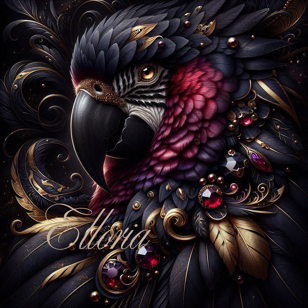 Plongez dans la majesté d’Aureus, un perroquet flamboyant sublimé par des plumes serties de joyaux et des détails dorés d’une grande finesse. Entre intensité du regard et éclat précieux, cette œuvre incarne à la fois la puissance et l’élégance d’un oiseau mythique, digne d’un trésor impérial. 🪶💎