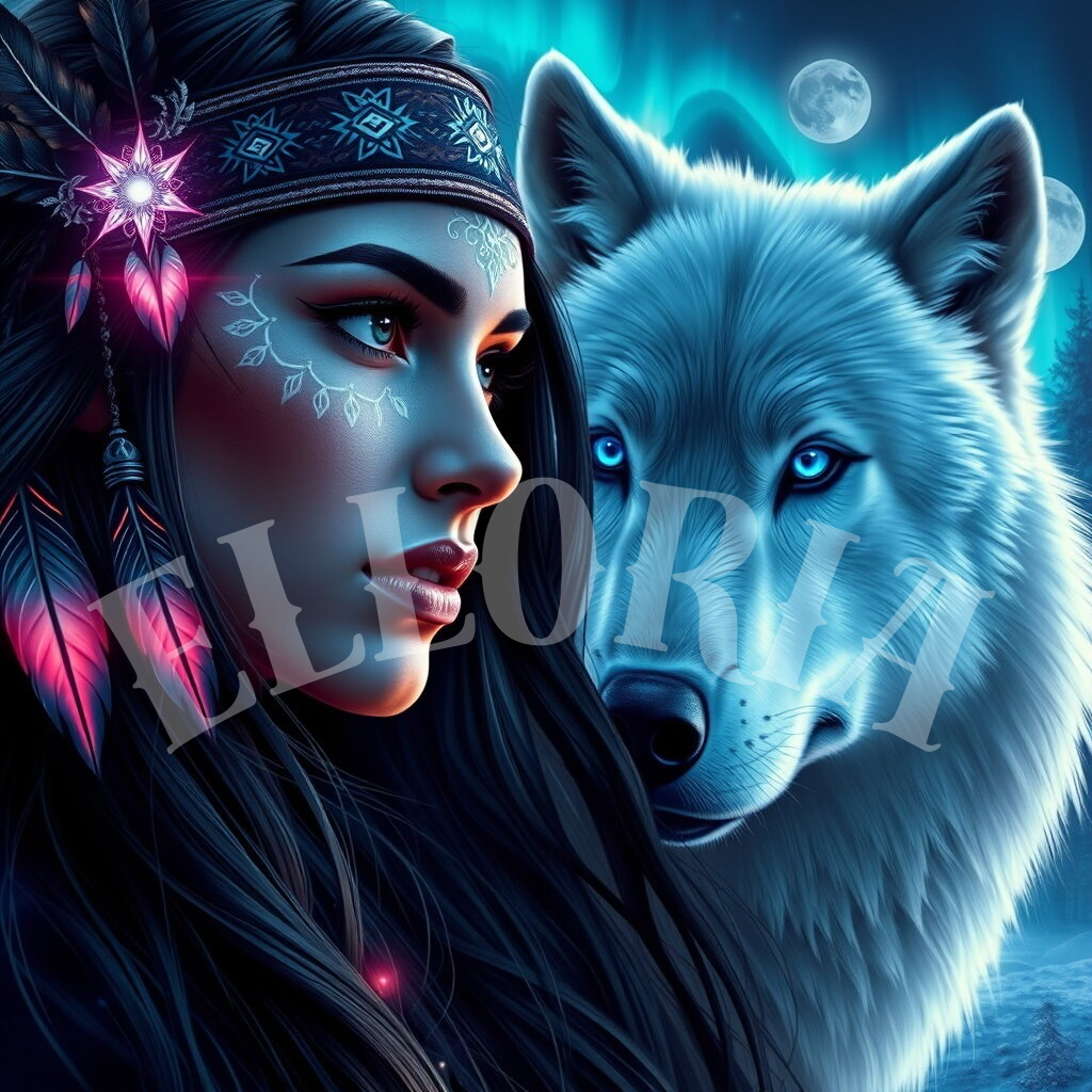 Une gardienne aux cheveux d’ébène et au regard intense, accompagnée de son loup blanc sous une aurore boréale, symbole de sagesse et de force lunaire.