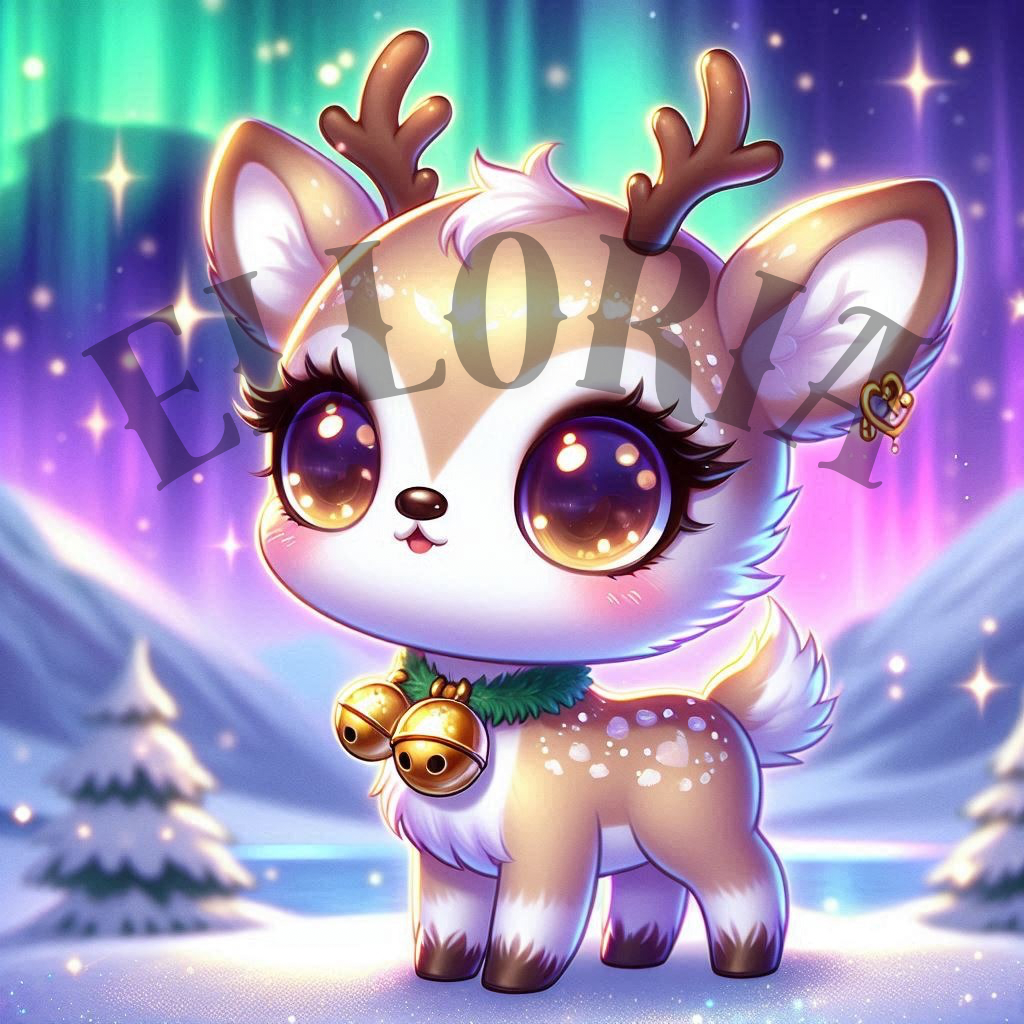Petit renne lumineux au regard doré, orné de grelots magiques, qui brille sous les aurores boréales.